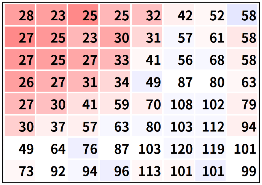 In each block, we know that we have a rough diagonal trend of values that start high in the top-left and get progressively closer to zero as we move to the bottom-right.