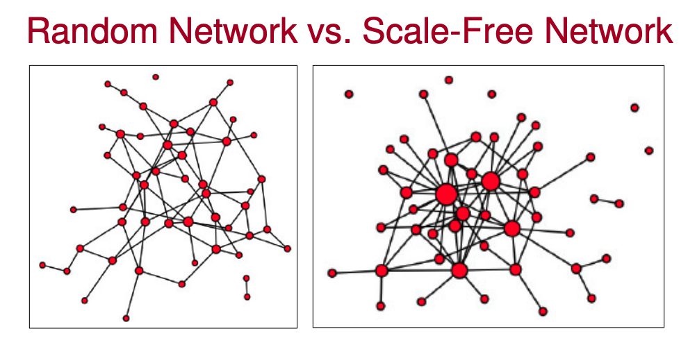 Once hubs are present, they change the way we navigate the network. In random networks, we usually need to make many hops. On scale-free networks, however, we can reach most destinations via a single hub. Scale-free networks mean that even as the sizes may differ widely between networks, navigation time across the networks is very slow to grow (ultra-small world network).